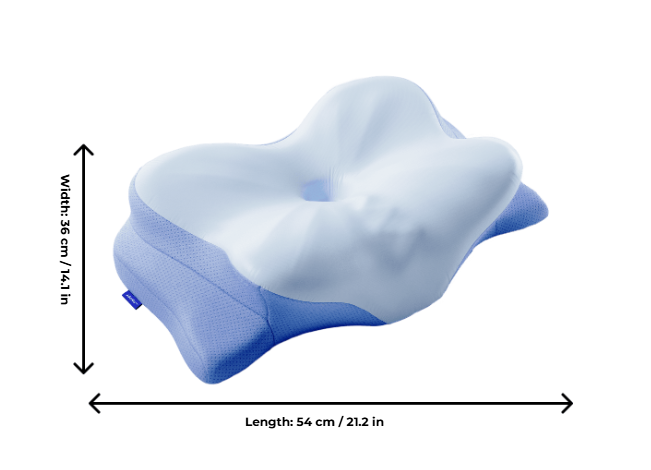 Unlike traditional rectangular pillows, it features a contoured shape intended to cradle the head while supporting the cervical spine.